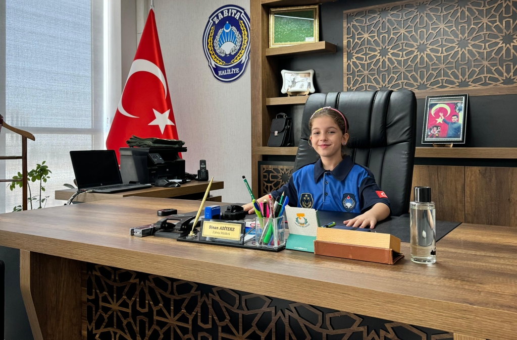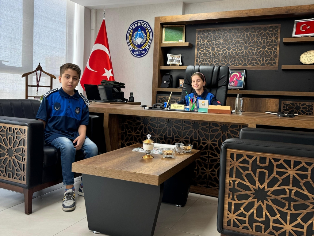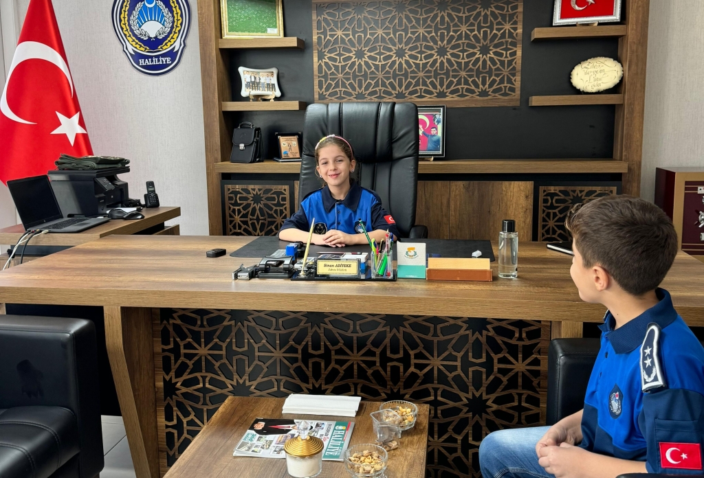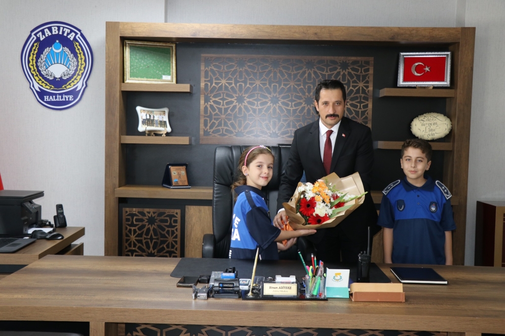 Şanlıurfa’da 23 Nisan Ulusal Egemenlik ve Çocuk Bayramı kapsamında Haliliye Belediyesi Zabıta Müdürlüğü’nü ziyaret eden minik öğrenciler, temsili olarak zabıta müdürünün makamına oturarak bayram coşkusunu yaşadı.