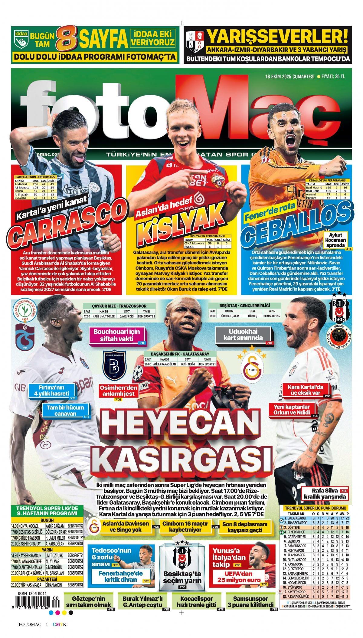 Fotomaç Gazetesi 18 Ekim 2025 Günü Manşeti