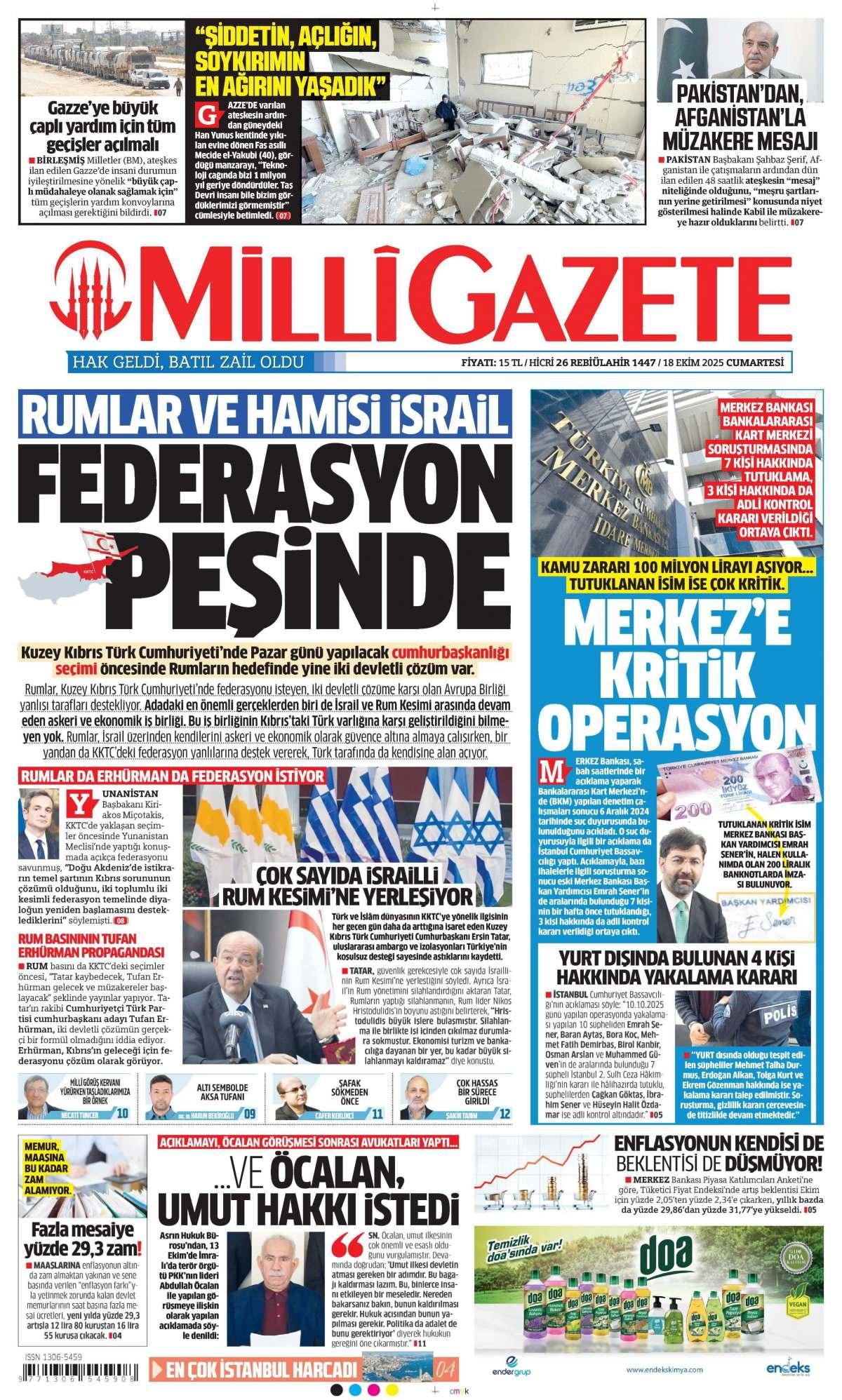Milli Gazetesi 18 Ekim 2025 Günü Manşeti