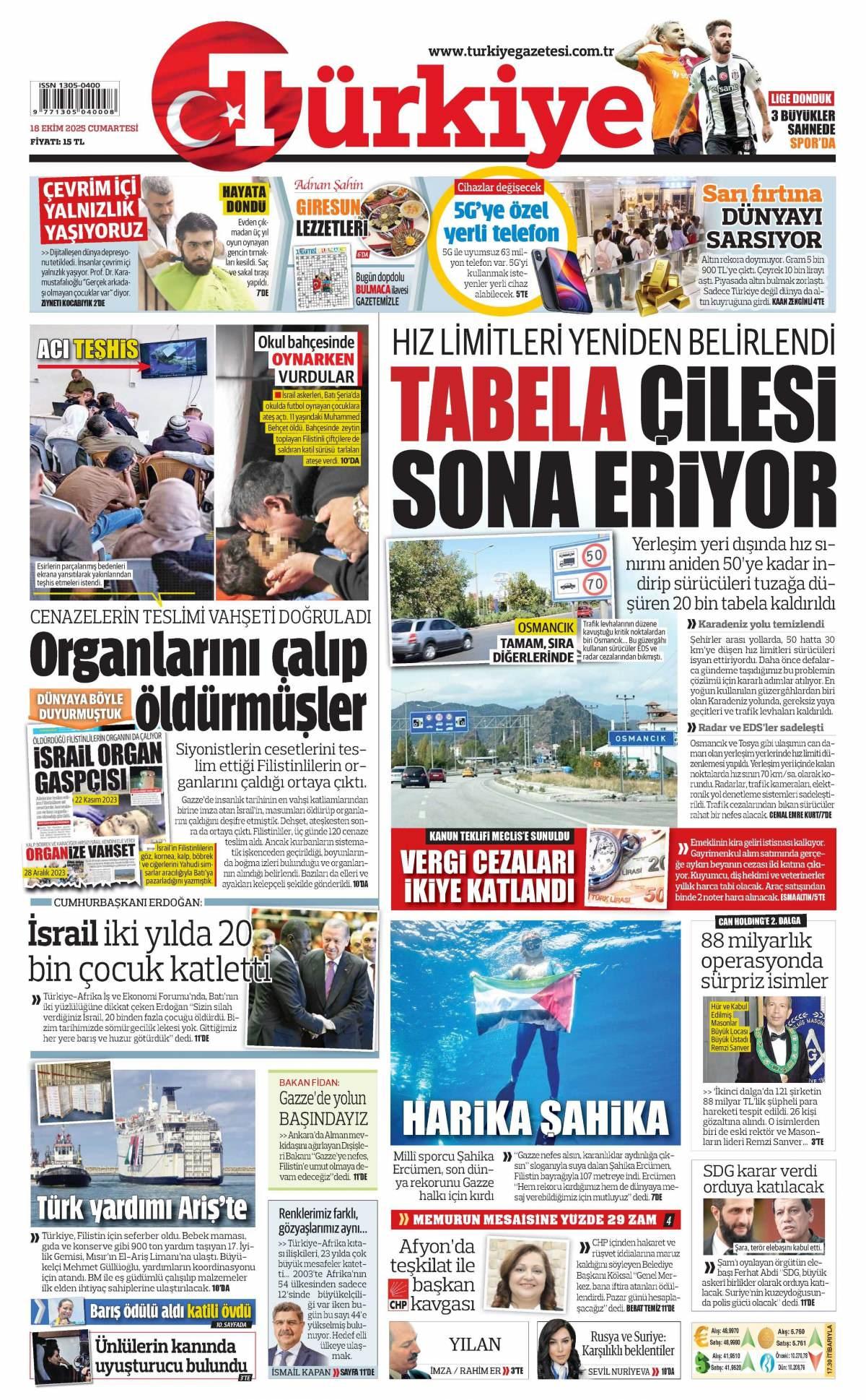 Türkiye Gazetesi 18 Ekim 2025 Günü Manşeti