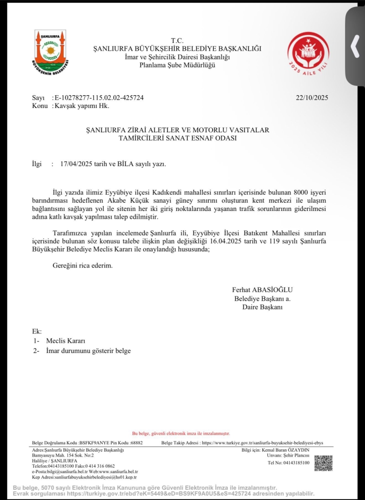 Şanlıurfa Büyükşehir Belediye Başkanımız Sayın Mehmet Kasım Gülpınar’a esnaf ve sanatkârlarımız adına teşekkür ediyoruz. AKABE Sanayi Sitesi trafik ulaşım sorunu tarih oluyor. Artık esnaflarımız yollarda kalmayacak, beklemeyecek.