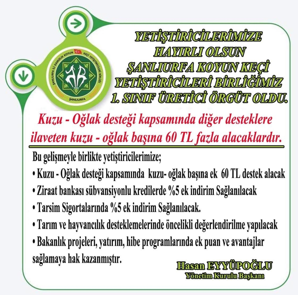 Şanlıurfa hayvancılığı açısından büyük önem taşıyan bir gelişme yaşandı. 2025 yılı yetiştirici birlikleri derecelendirme sonuçlarına göre Şanlıurfa Koyun Keçi Yetiştiricileri Birliği, yapılan değerlendirmeler sonucunda “1. Sınıf Üretici Örgütü” olmaya hak kazandı.Tarım ve Orman Bakanlığı tarafından 27 Ekim 2025 tarihinde açıklanan sonuçlara göre, Türkiye genelinde yaklaşık 13 bin üretici örgütü ve kooperatif arasından sadece 141’i 1. sınıf statüsüne girmeyi başardı. Şanlıurfa Koyun Keçi Yetiştiricileri Birliği de bu seçkin kuruluşlar arasında yer aldı.Üreticilere Ek Destek ve AvantajlarBirliğin 1. sınıf üretici örgütü olmasıyla birlikte, üyeler önemli desteklerden yararlanacak:Kuzu ve oğlak desteği kapsamında hayvan başına 60 TL ek ödeme yapılacak.Ziraat Bankası sübvansiyonlu kredilerinde ek %5 indirim sağlanacak.TARSİM sigortalarında ek %5 indirim uygulanacak.Tarım ve hayvancılık desteklemelerinde öncelikli değerlendirme hakkı tanınacak.Bakanlık projeleri, yatırım ve hibe programlarında öncelik ve ek avantajlar sağlanacak.Ayrıca Birlik, Tarım ve Orman Bakanlığı’nın sektörle ilgili çalışmaları ve politikalarında görüşlerini daha etkin şekilde ifade edebilecek.“Bu Başarı Tüm Üyelerimizin Ortak Emeğidir”Şanlıurfa Koyun Keçi Yetiştiricileri Birliği Yönetim Kurulu Başkanı Hasan Eyyüpoğlu, elde edilen başarının tüm üyelerin ortak emeğiyle gerçekleştiğini belirterek şu ifadeleri kullandı:> “Bu önemli başarı, üyelerimizin, çalışanlarımızın ve paydaşlarımızın ortak gayretiyle elde edilmiştir. Birliğimiz, Şanlıurfa hayvancılığını daha ileri taşımak ve yetiştiricimizin yanında olmaya devam etmek için aynı kararlılıkla çalışmalarını sürdürecektir. Emeği geçen tüm mesai arkadaşlarıma, yönetim kurulumuza ve üyelerimize teşekkür eder, bu başarının ilimize ve hayvancılık sektörümüze hayırlı olmasını dilerim.”Şanlıurfa Koyun Keçi Yetiştiricileri Birliği’nin 1. sınıf statüsüne yükselmesi, hem bölge hayvancılığına hem de üreticilere yeni fırsatlar sunacak önemli bir adım olarak değerlendiriliyor.