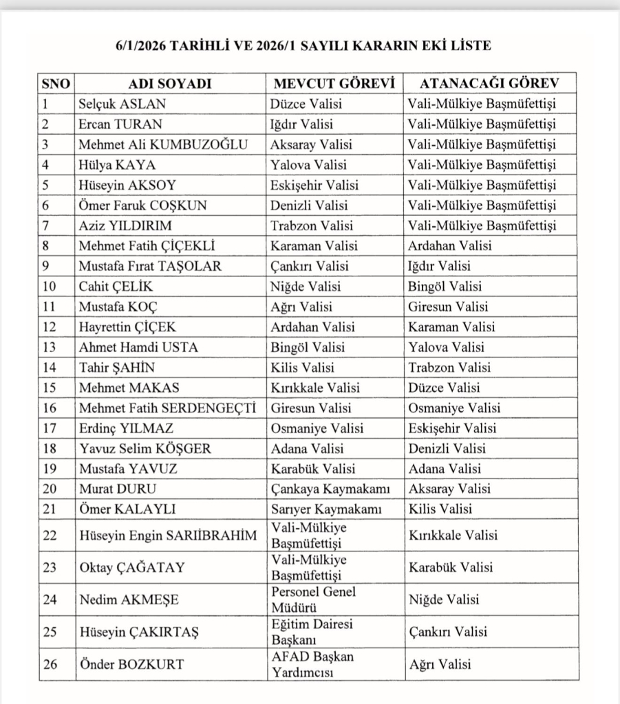 Haberler Gündem Son Dakika! Valiler Kararnamesi Açıklandı! 7 İlin Valisi Merkeze Çekildi!Son Dakika! Valiler Kararnamesi Açıklandı! 7 İlin Valisi Merkeze Çekildi! 7 Ocak 2026, 01:06 yayınlandı 7 Ocak 2026, 01:07 güncellendi 0dk, 8sn + - Cumhurbaşkanı Erdoğan’ın imzası ile Resmi Gazete’de yayımlanan Valiler Kararnamesi’ne göre; 7 vali merkeze çekilirken, 19 valilikte görev değişikliği oldu. İşte liste Son Dakika! Valiler Kararnamesi Açıklandı! 7 İlin Valisi Merkeze Çekildi! Yorum Yap Paylaş Haberle ilgili daha fazlası:# #urfa # manset # Şanlıurfa # üst