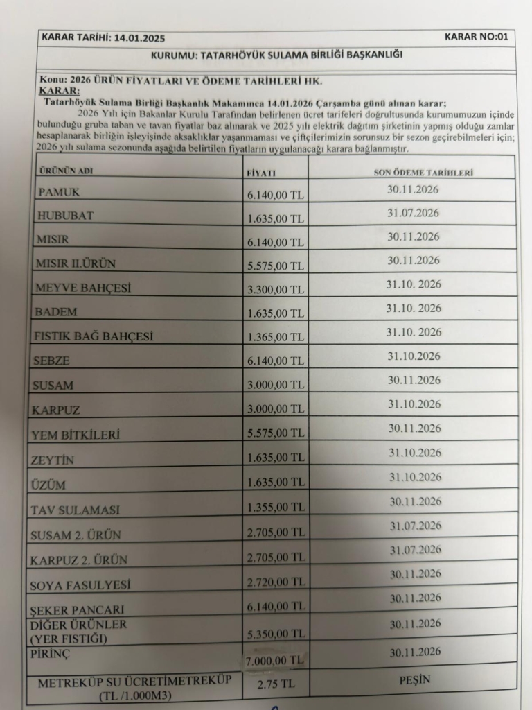 Tatarhöyük Sulama Birliği’nin dönüm başı sulama fiyatlarına yaptığı yüksek zam, bölgedeki çiftçilerin tepkisini büyüttü.